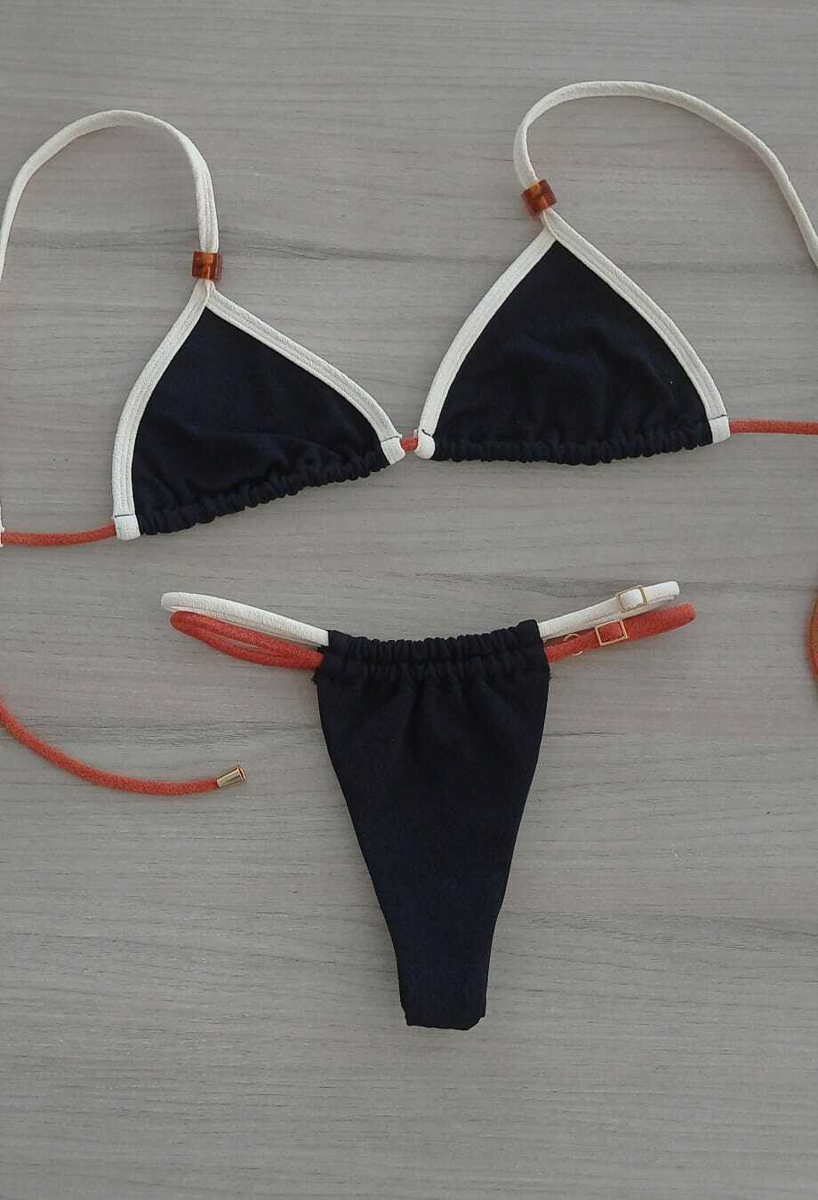 Nosso Biquíni Viés é feito na malha Crespinho em preto, viés off white, e detalhes em terracota . Sutiã cortininha com com amarração nas costas, alça com regulagem e casinha, aviamento em acrilíco.
